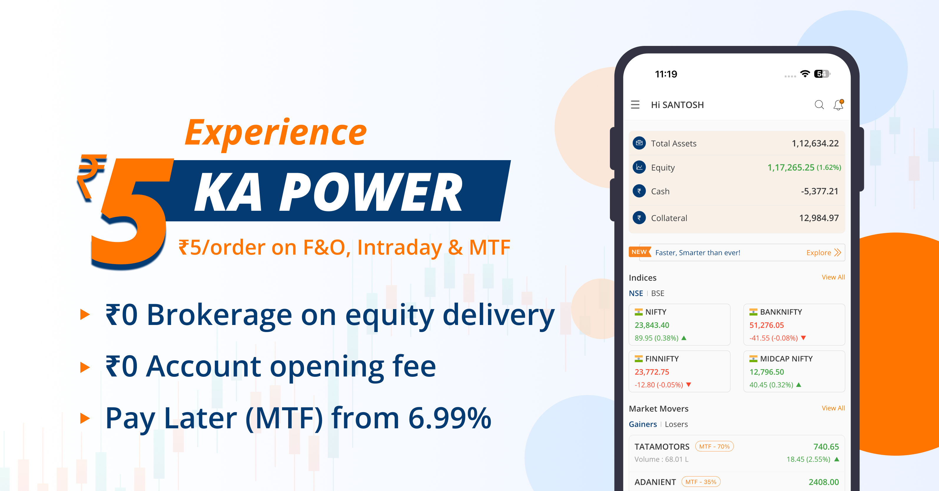 ₹5 brokerage on Intraday, F&O, Pay Later (MTF), Currency etc.